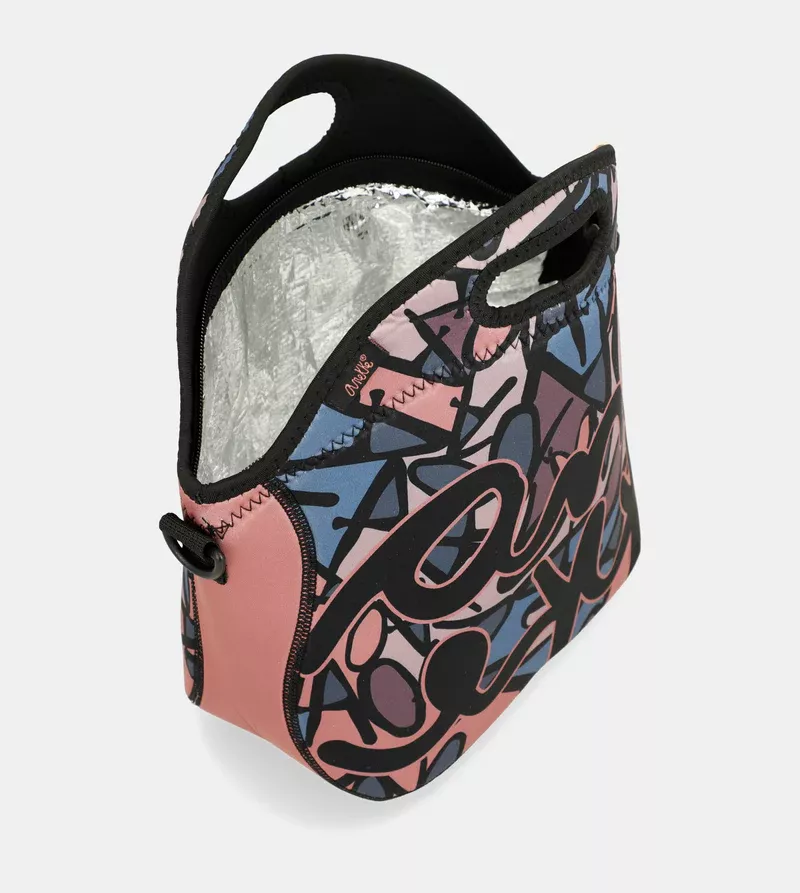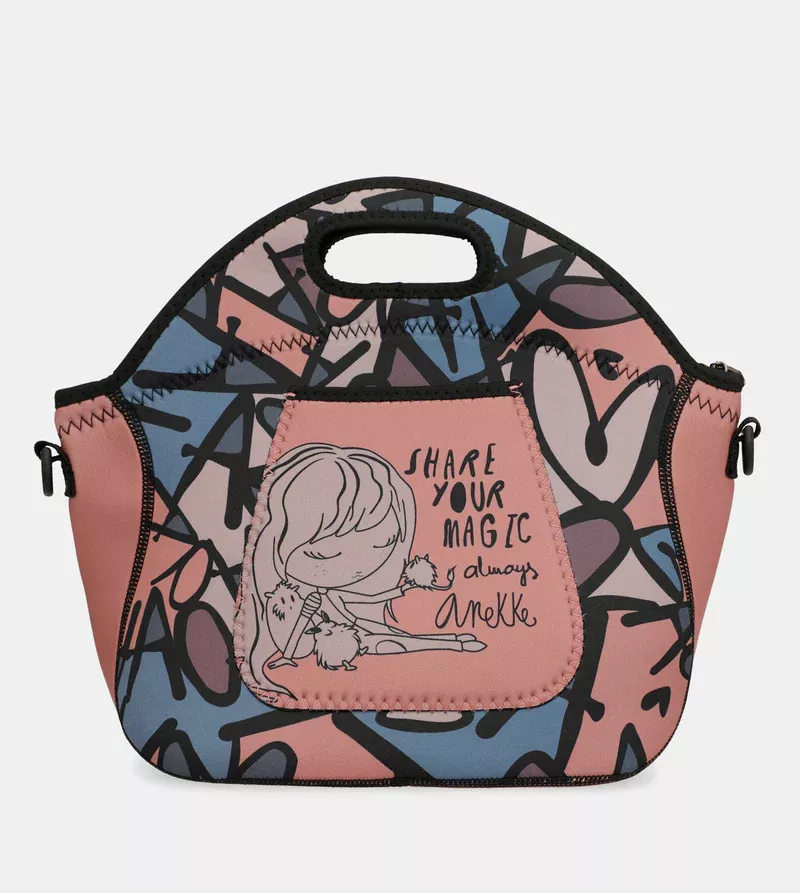 Su original diseño con una base estampada en diferentes colores y la silueta de Anekke te recordará a diario que también tu bolso para llevar la comida puede ser, además de útil, súper original. Se abre por la parte superior mediante cremallera, y además, tiene dos asas de mano para transportarlo y un pequeño bolsillo trasero.