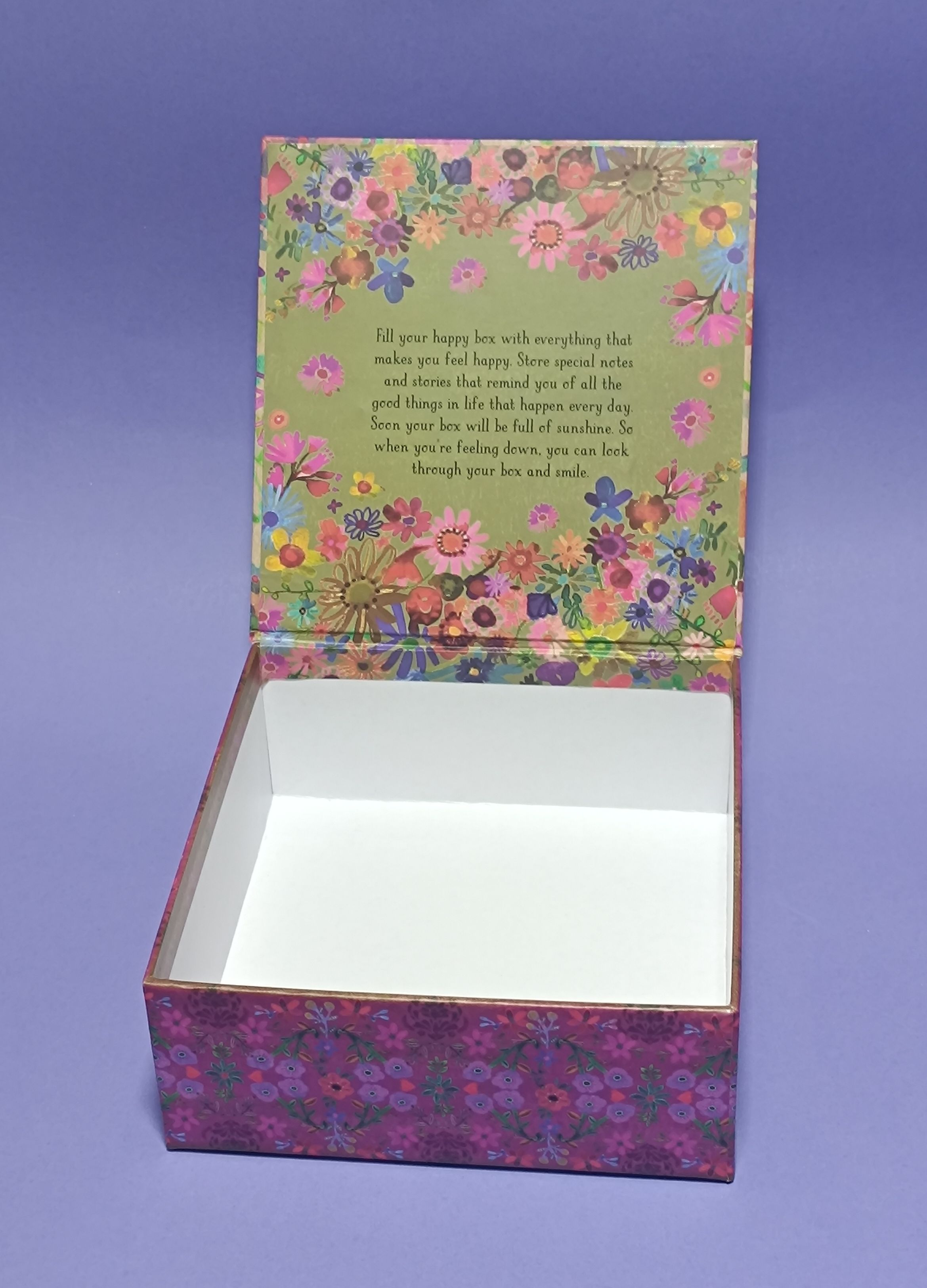 Las cajas de felicidad son perfectas para llenarlas de regalitos, notitas y sorpresas que saquen las caras más sorprendentes a quien la recibe, pero también a quien ve con cierta envidia sana las cositas pensadas con mucho cariño y conciencia. ¿Y tú ? ¿ No serás una de esas personas detallistas, que llenan cajas con notas y cosas de fantasía?